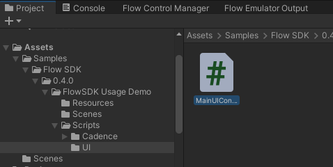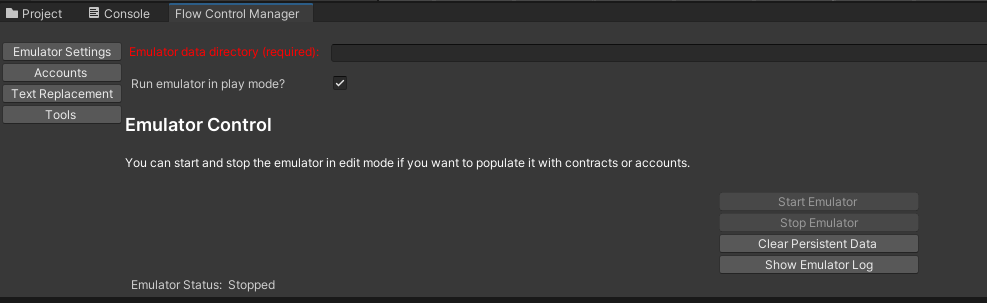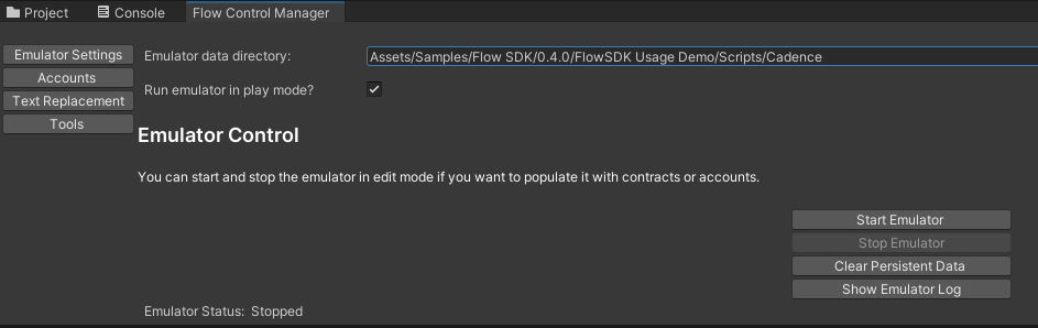 To run the emulator, we need to specify which directory to run it from, remembering that it requires a flow.json file. Click the browse button and select the folder in the sample that contains the flow.json file (it should be in Assets/Samples/Flow SDK/<version>/FlowSDK Usage Demo/Scripts/Cadence):