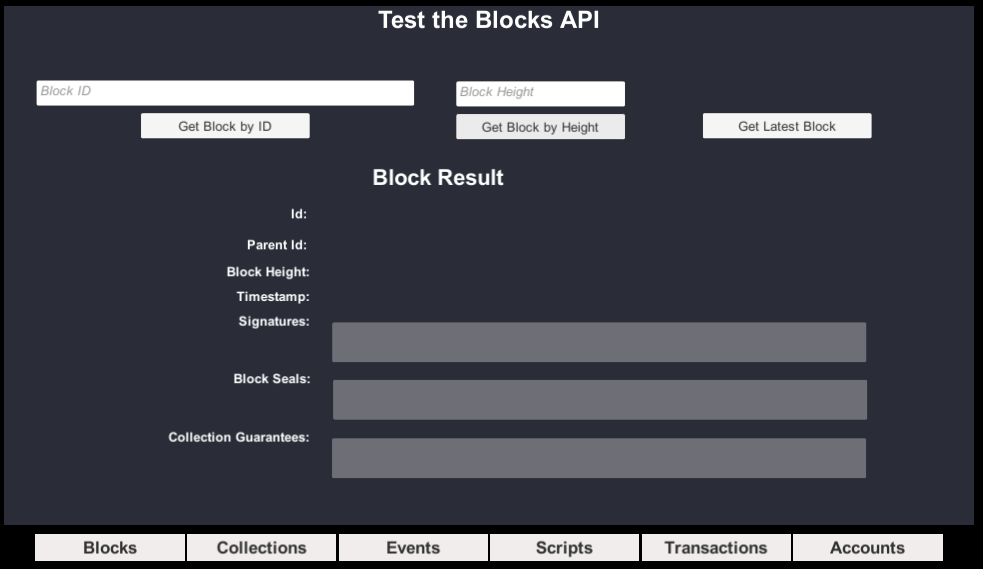 For both of the API calls, the dropdown in the bottom left will populate with a list of blocks. Selecting a block in the list will populate the right-hand side with the event results.
