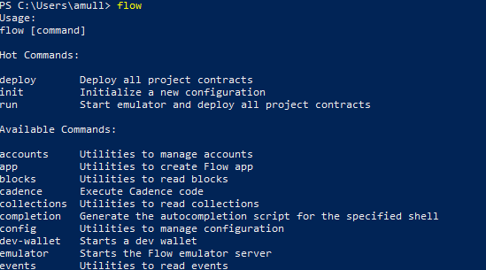 To test that the Flow emulator is installed correctly, open a command line interface, type flow and press enter. You should see something like this: