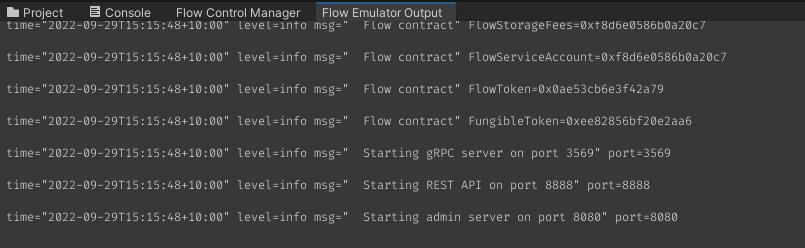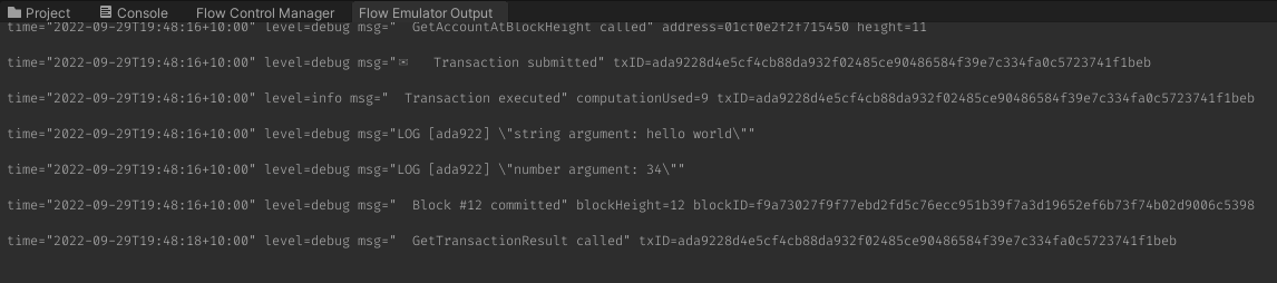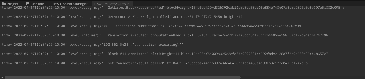 Now go to the Flow Emulator Output and scroll to the bottom. You should see several things - the transaction was submitted, executed, the log message in the cadence code was printed, and a new block was committed.