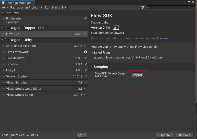 - On the right, expand Samples and click Import next to FlowSDK Usage Demo.